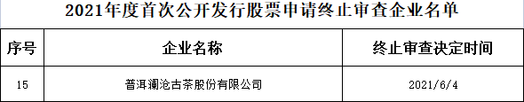 據(jù)中國(guó)證監(jiān)會(huì)網(wǎng)站6月11日消息,中國(guó)證監(jiān)會(huì)決定對(duì)普洱瀾滄古茶股份有限公司(以下簡(jiǎn)稱“瀾滄古茶”)首次公開發(fā)行股票申請(qǐng)終止審查。
