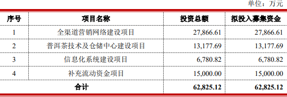 瀾滄古茶原擬在深交所主板公開發(fā)行不超過2000萬股人民幣普通股(A股),占公司本次公開發(fā)行后總股本的比例不低于25%。瀾滄古茶原擬募集資金6.28億元,分別用于“全渠道營(yíng)銷網(wǎng)絡(luò)建設(shè)項(xiàng)目”、“普洱茶技術(shù)及倉(cāng)儲(chǔ)中心建設(shè)項(xiàng)目”、“信息化系統(tǒng)建設(shè)項(xiàng)目”、“補(bǔ)充流動(dòng)資金項(xiàng)目”。